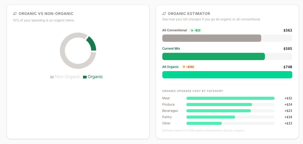 This is exactly what receipt-level tracking makes possible. GroceryTrack's Organic Estimator shows you three numbers side by side: what you'd spend going all-conventional, your current mix, and what all-organic would actually cost — broken down by category.